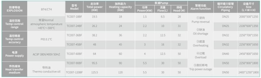 | 防爆等級 EXPLOSION | BT4/CT4 | 型號 Model | 總功率 Total power (KW) | 加熱能力 Heating capacity (KW) | 泵浦Pump | 警報功能 Alarm function | 循環(huán)媒介配管Circulatory Piping | 設(shè)備尺寸 Size (L×W×H) | ||